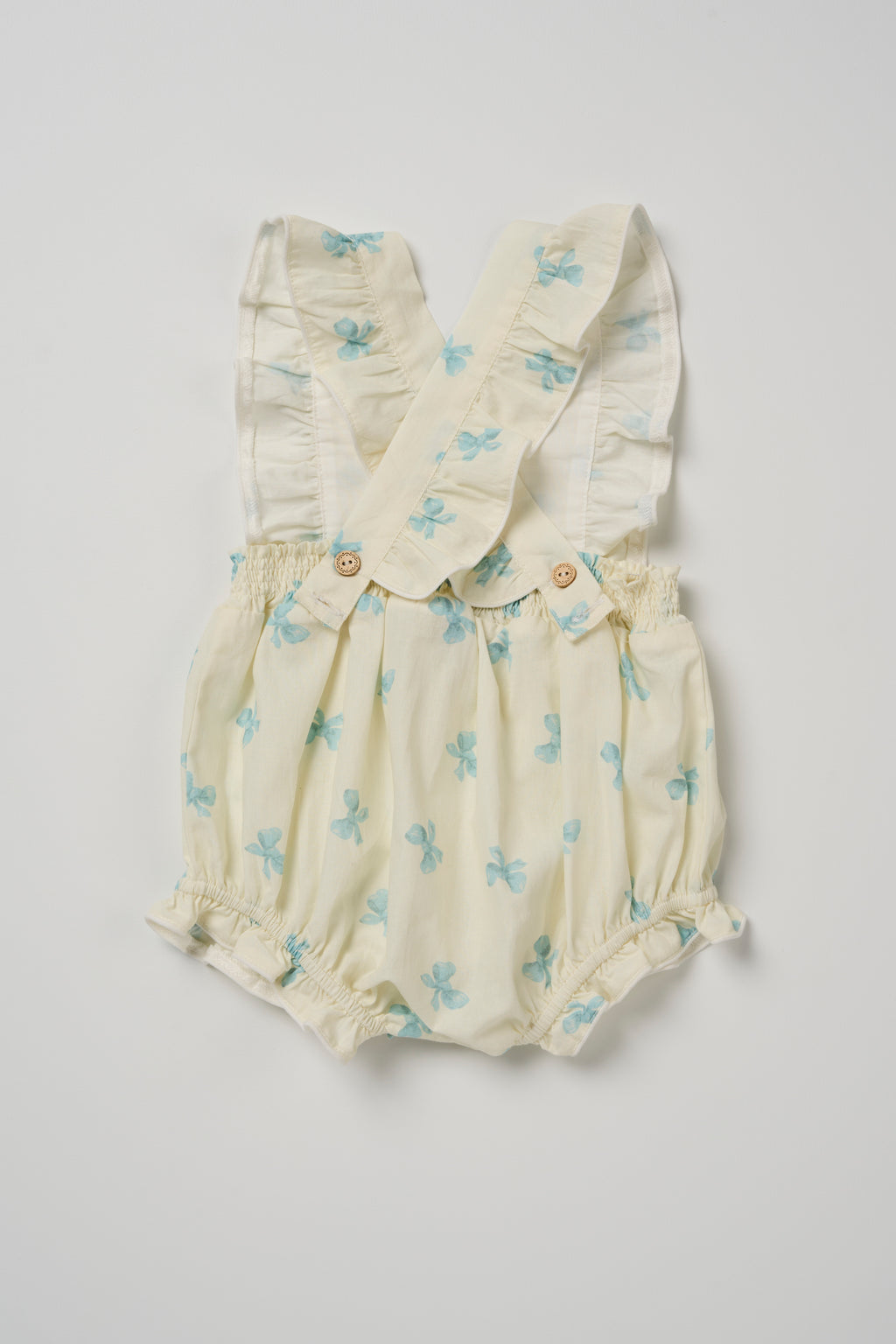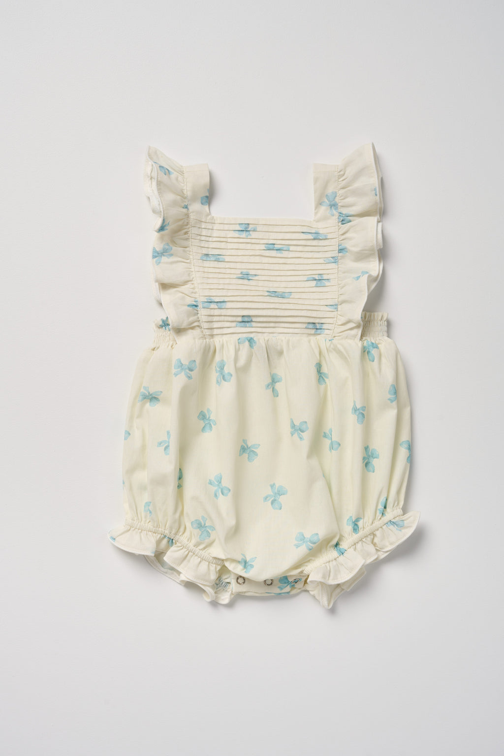 Relaxed fit Romper with pin tuck across front. Gorgeous frilled ruffled edge sleeve edged in white. Elastic ruffle leg edged in white with stud crotch. Loose elastic waist with crisscross adjustable straps that button with 2 sizes.