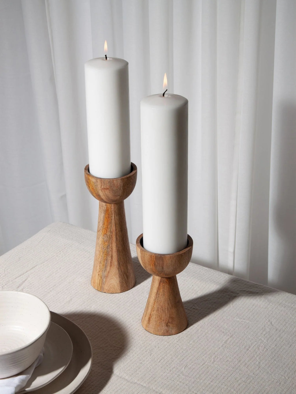 Crafted from Mango Wood this Wooden Pillar Candle Holder presents a captivating array of grain patterns, these innate patterns imbue each piece with a unique and visually compelling aesthetic. Beneath its natural beauty lies a thoughtful innovation, an internal metal cap, discreet yet essential, ensuring the effortless management of candle wax.